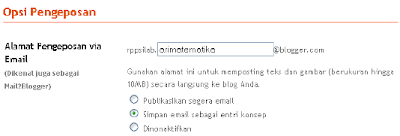 Langkah-langkahnya adalah sebagai berikut : 1. Buat satu blog dengan tema tertentu, misalnya ttg "Islam" 2. Pada tab "pengaturan" pilih sub menu "email and Selluler" seperti gambar dibawah ini : ![]() 3. Pada Opsi pengeposan isikan alamat email yg saudara inginkan, email ini merupakan Subdomain dari Email Google,, saudara bisa lihat pada gambar. Pada gambar diatas email google nya adalah rppsilab[at] gmail.com dengan sub email yang saya isikan arimatematika. Jadi emailnya adalah rppsilab.arimatematika[at]blogger.com. Perlu diingat pada bagian bawah gambar diatas tandai "simpan email sebagai entri konsep" agar kita rapikan dahulu sebelum di terbitkan. [inilah yang saya maksud dengan Semi Generated Content For Blogspot, artikelnya masuk secara otomatis, tetapi masih perlu edit manual agar rapi ketika kita tampilkan dalam postingan.